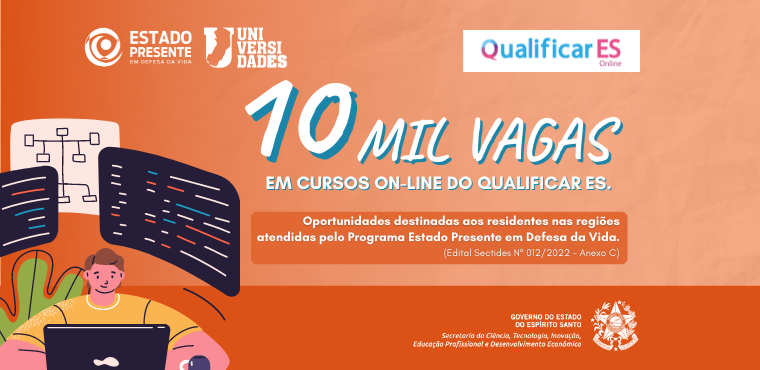 O Governo do Estado abre, nesta terça-feira (07), as inscrições para os cursos on-line do Qualificar ES nas regiões de atuação do Programa Estado Presente em Defesa da Vida. São dez mil vagas distribuídas em dez cursos diferentes, com carga horária de 120 horas. As vagas são destinadas para os municípios de Aracruz, Cachoeiro de Itapemirim, Colatina, Guarapari, Linhares, São Mateus, Cariacica, Vila Velha, Serra e Vitória. O prazo das inscrições termina no próximo dia 17 de junho.