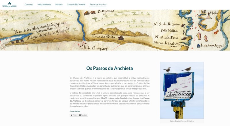 Também é possível ver algumas informações sobre os Passos de Anchieta, com fotos, o roteiro e destaques históricos do caminho que José de Anchieta fazia com frequência entre Vitória e Benevente (atual Anchieta). “Com isso, acredito que o site se torna o lugar ideal para se explorar conhecimentos históricos e atuais sobre o meio ambiente e a mata atlântica no Espírito Santo, celebrando o olhar dos próprios capixabas sobre esses elementos que marcam a nossa paisagem”, pontua o historiador.