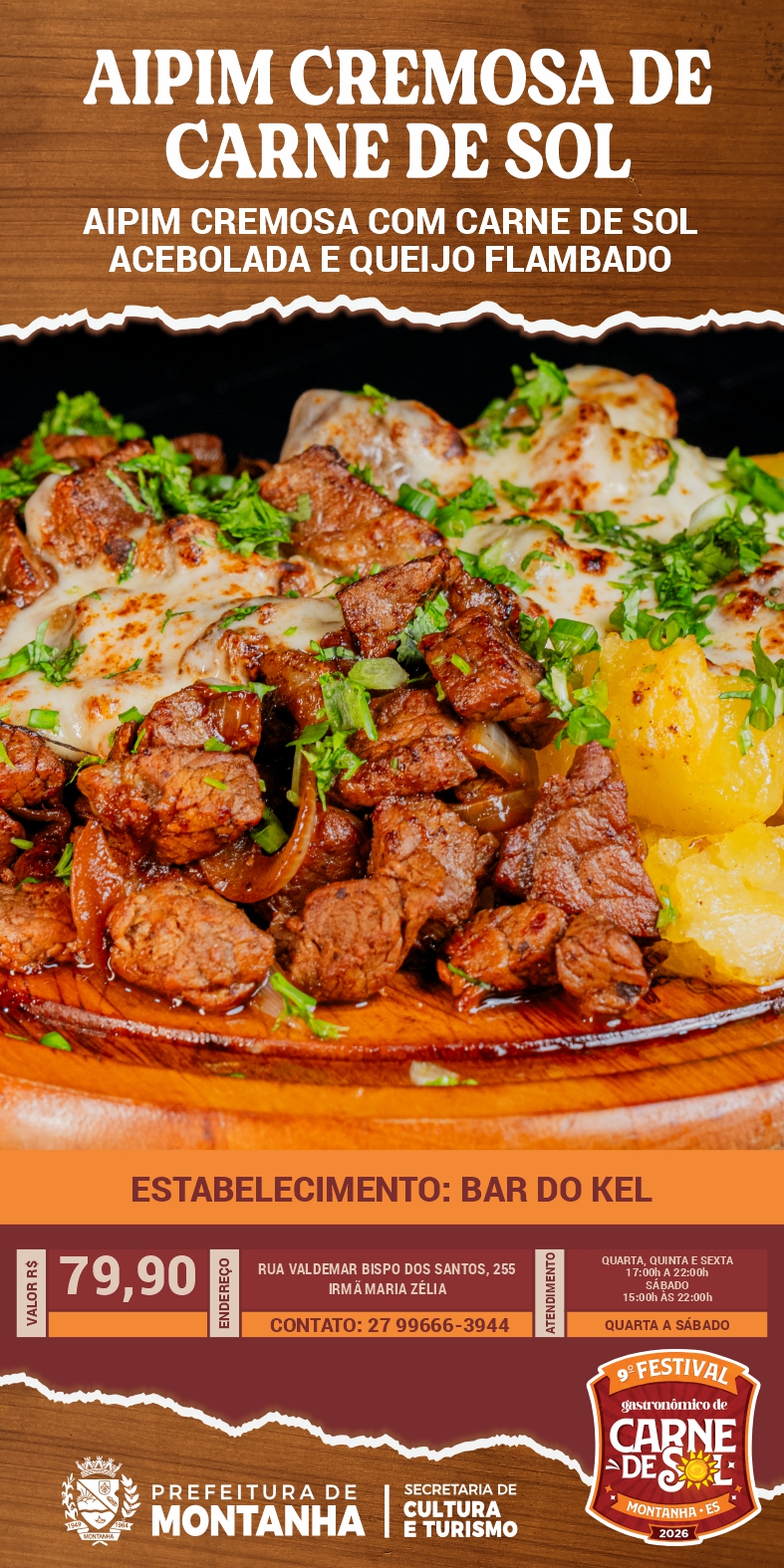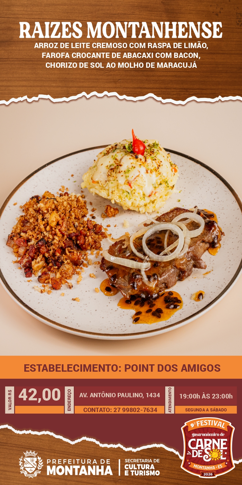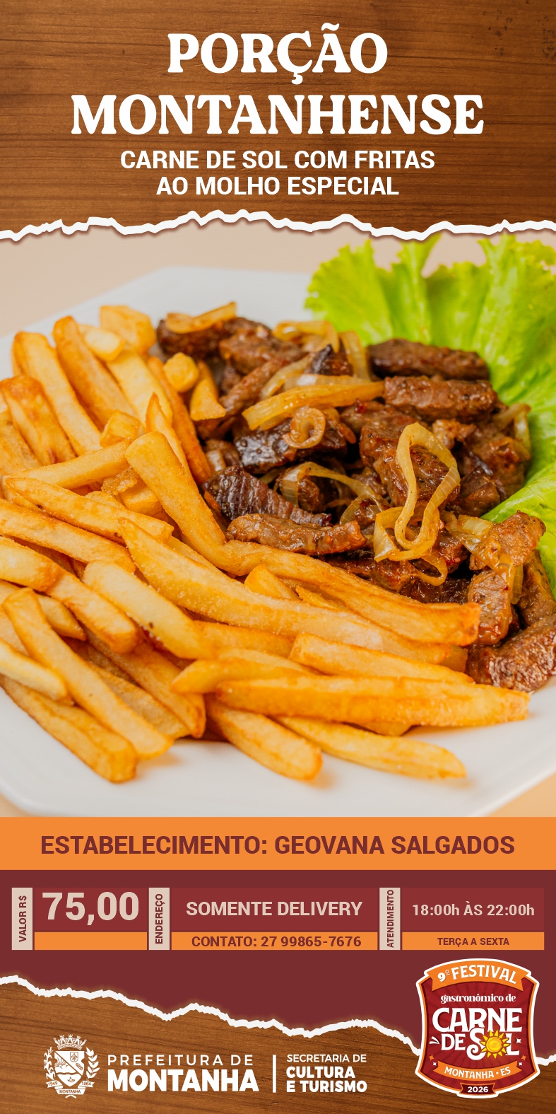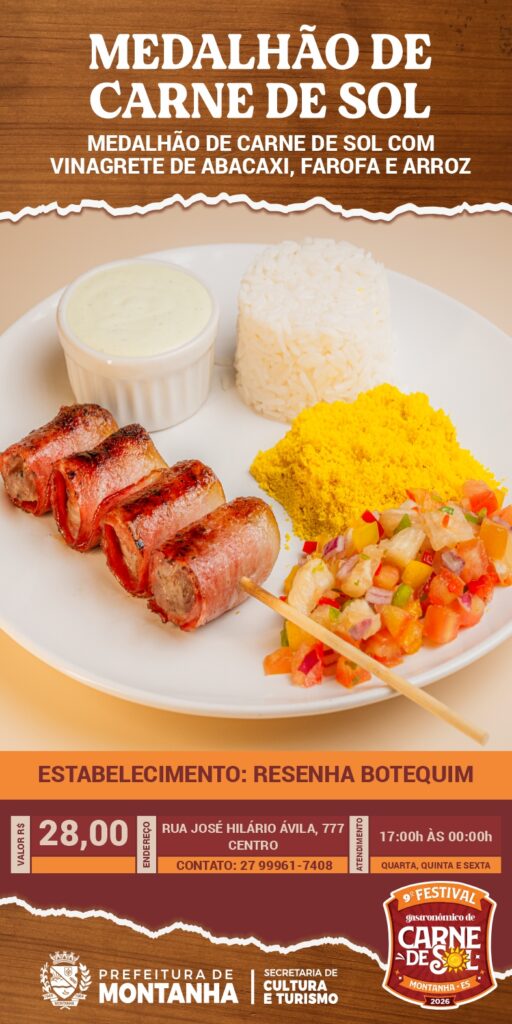 A Prefeitura de Montanha, através da Secretaria Municipal de Cultura e Turismo, convida toda a população e visitantes a continuarem vivenciando os sabores do 9º Festival Gastronômico da Carne de Sol através do Roteiro Gastronômico, que segue até o dia 16 de maio nos estabelecimentos participantes.