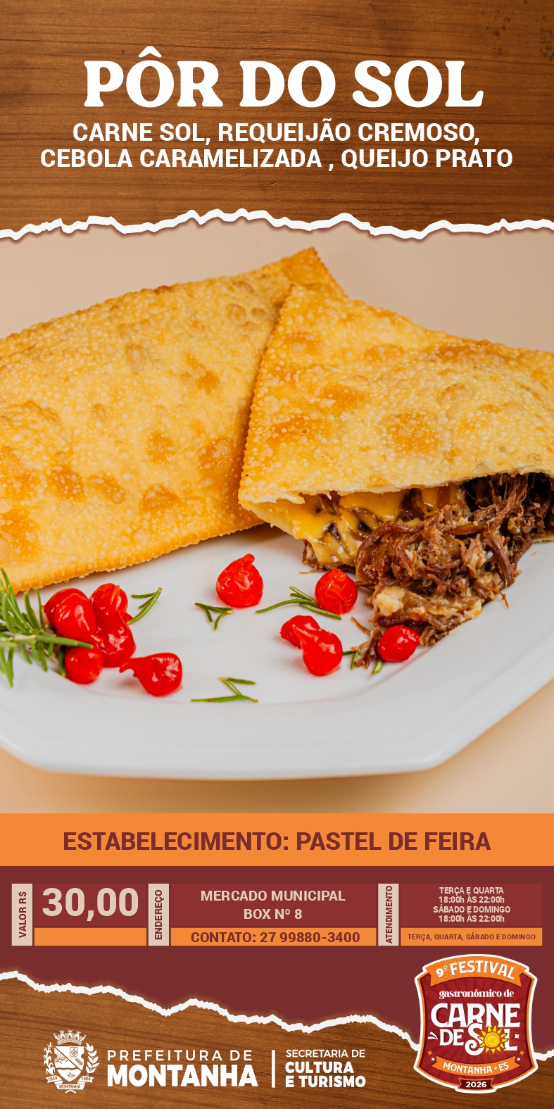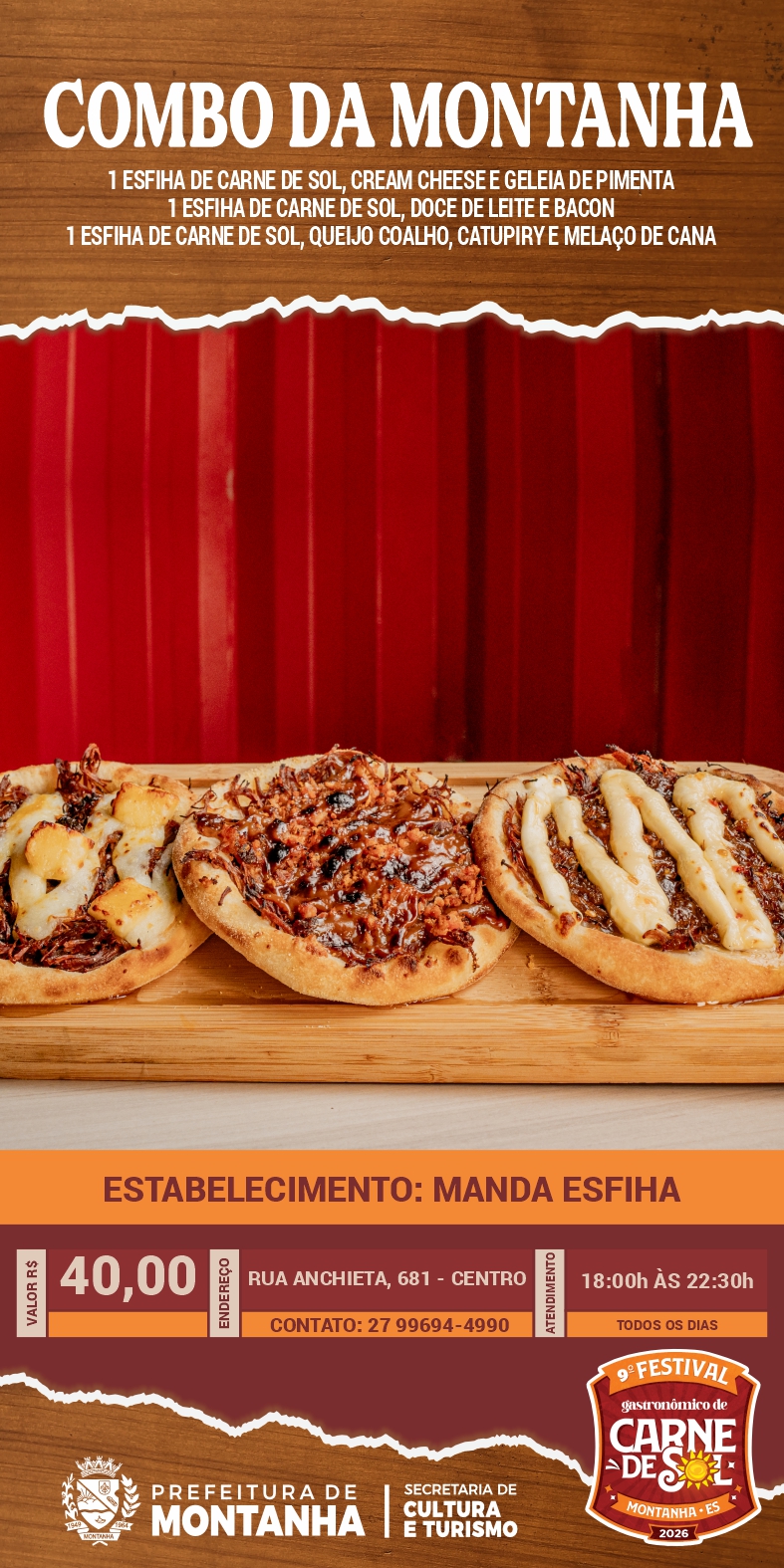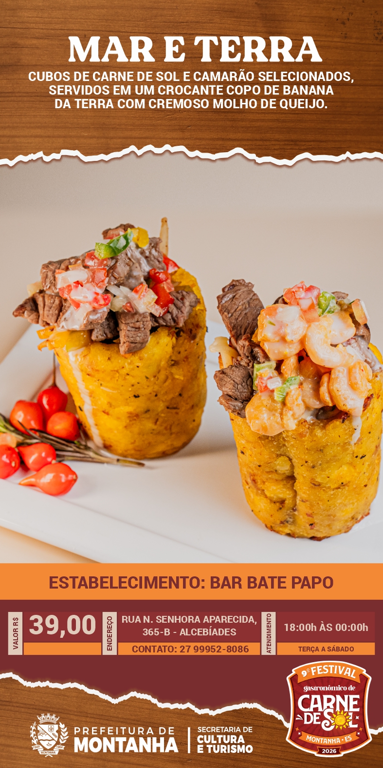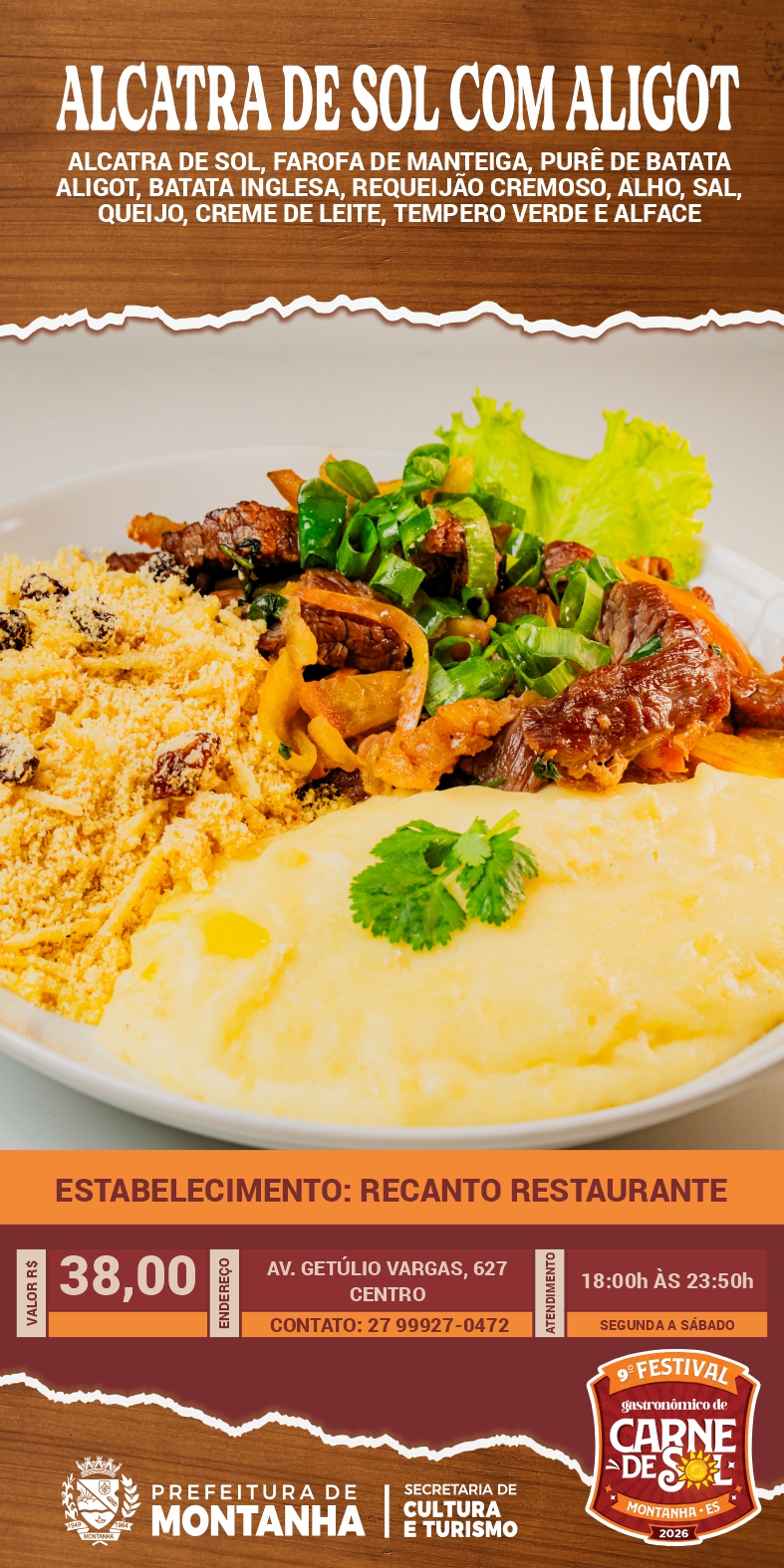 A Prefeitura de Montanha, através da Secretaria Municipal de Cultura e Turismo, convida toda a população e visitantes a continuarem vivenciando os sabores do 9º Festival Gastronômico da Carne de Sol através do Roteiro Gastronômico, que segue até o dia 16 de maio nos estabelecimentos participantes.