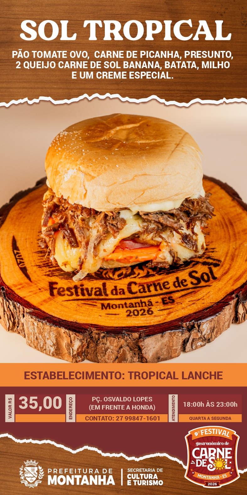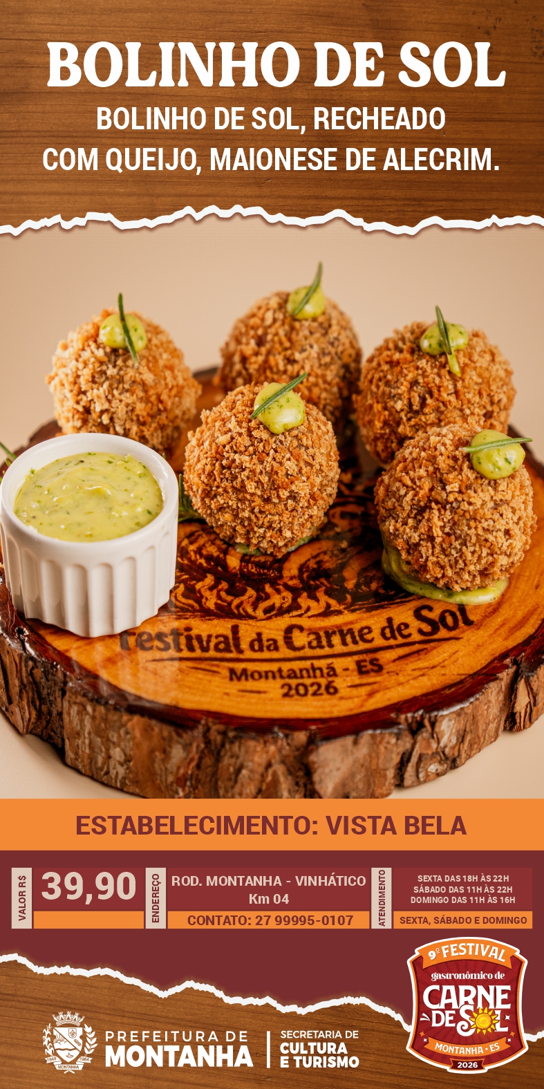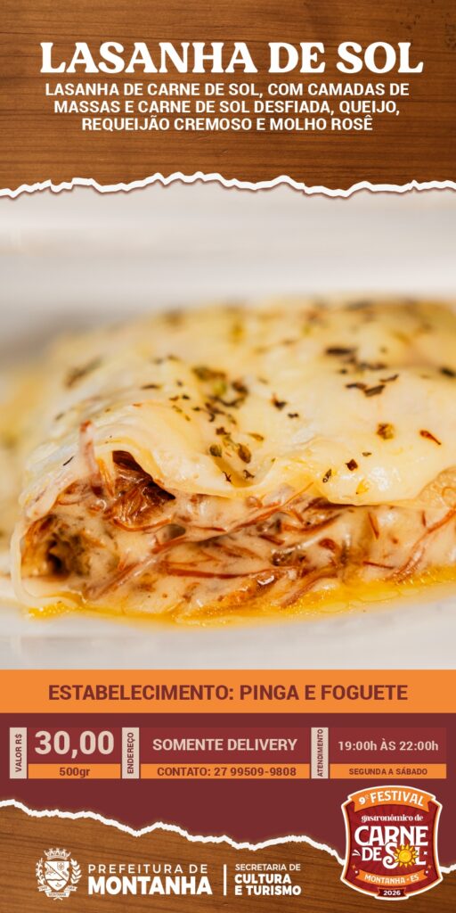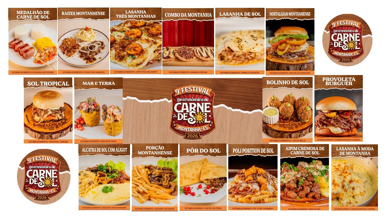 Cada estabelecimento preparou receitas únicas, que traduzem a criatividade, a tradição e a identidade culinária de Montanha. Entre as delícias disponíveis estão o irresistível Bolinho de Sol, do Restaurante Vista Bela; as autênticas Raízes Montanhenses, do Point dos Amigos; a saborosa Lasanha de Sol, do Pinga e Foguete; e o refrescante e criativo Sol Tropical, do Tropical Lanches.