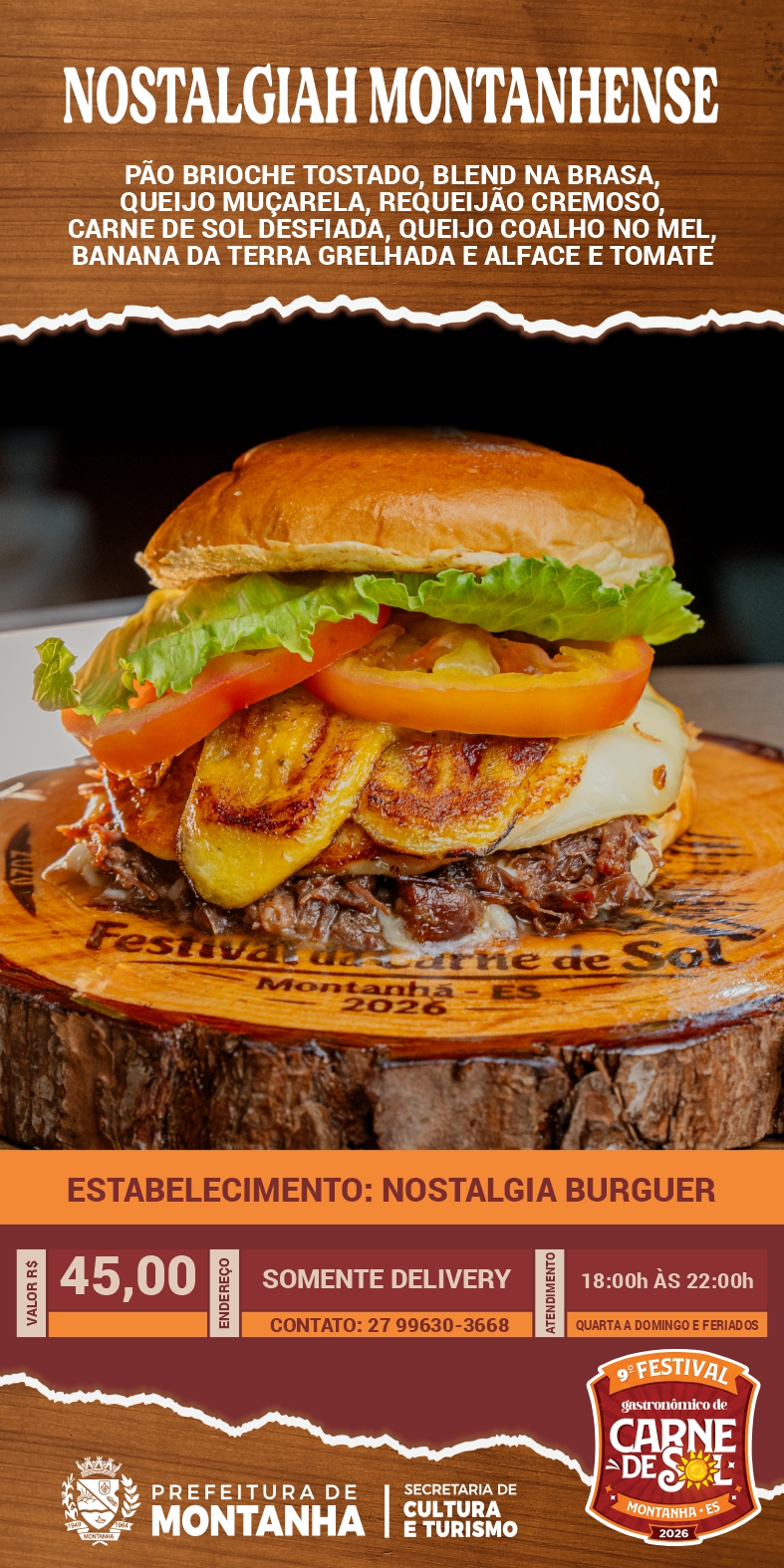 Para quem busca inovação e memória afetiva, o roteiro traz ainda o Nostalgiah Montanhense, do Nostalgia Burguer; o cremoso Aipim com Carne de Sol, do Bar do Kel; o criativo Pastel Pôr do Sol, do Pastel de Feira; e o suculento Medalhão de Carne de Sol, do Resenha Botequim.