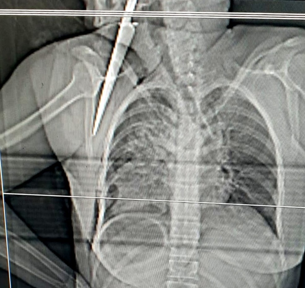 Imagens de raio-x mostram a lâmina de 20 cm presa na vítima. Crime aconteceu porque o autor das facadas não aceitava o fim do relacionamento. Ela foi operada para a remoção do objeto e o quadro de saúde é estável.