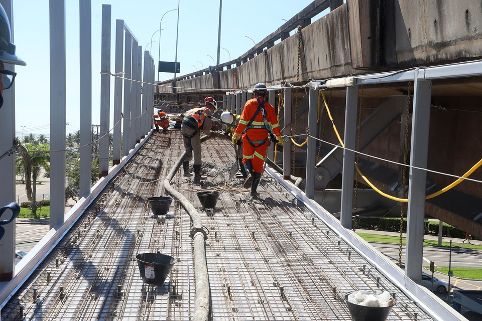 As obras de ampliação da Terceira Ponte e da construção da Ciclovia da Vida avançam em ritmo acelerado. Nesta terça-feira (23), teve início a concretagem do piso da ciclovia, mais uma etapa na execução dos serviços. As obras tiveram início em julho deste ano com a montagem da plataforma que funciona como o andaime para execução dos trabalhos. Com parte da estrutura metálica da ciclovia já fixada, têm início os serviços de concretagem do piso da ciclovia.